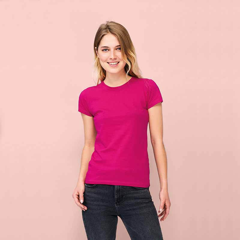 Λεπτομέρειες: Sol's γυναικείο t-shirt με κοντά μανίκια, εφαρμοστή γραμμή, λεπτή λαιμόκοψη σε jersey, πλαϊνές ραφές και φακαρόλα στο λαιμό.