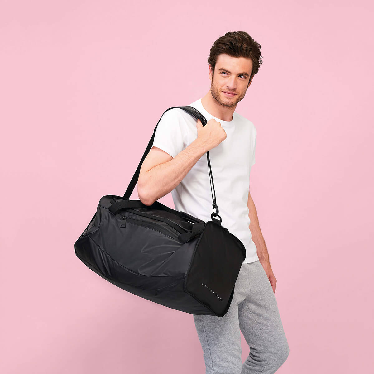 Λεπτομέρειες: Μεγάλο άνοιγμα στην επάνω πλευρά με διπλό φερμουάρ. Χερούλια με άνετη λαβή. Ρυθμιζόμενος και αποσπώμενος ιμάντας για μεταφορά στην πλάτη ή τον ώμο και μια μεα μπροστινή τσέπη με φερμουάρ. Μια πλαϊνή τσέπη με δίχτυ, μια εσωτερική τσέπη με φερμουάρ και με οπή εξαερισμού.